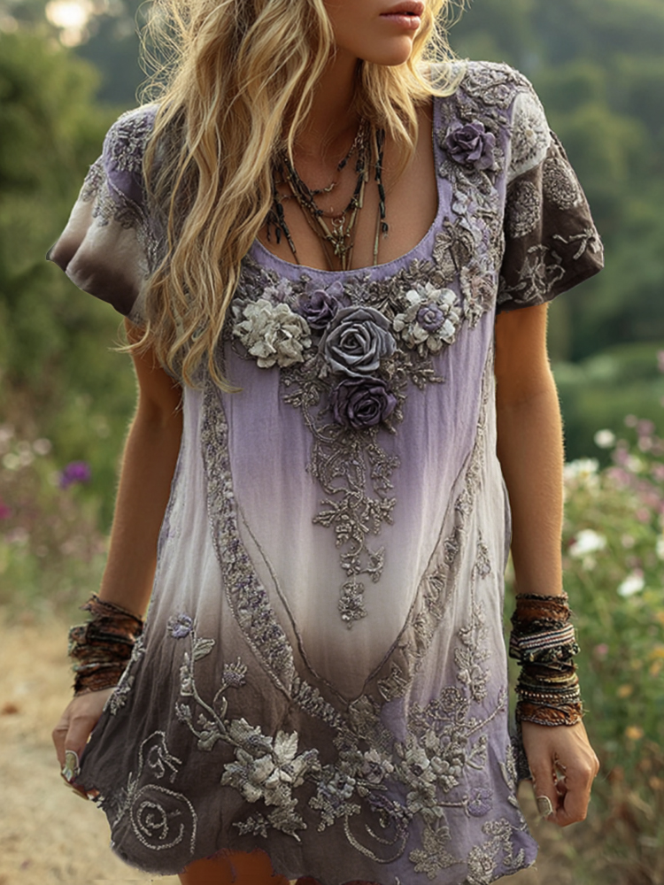Classy Purple Lavender And Floral Embroidered Linen Short Sleeve T-shirt