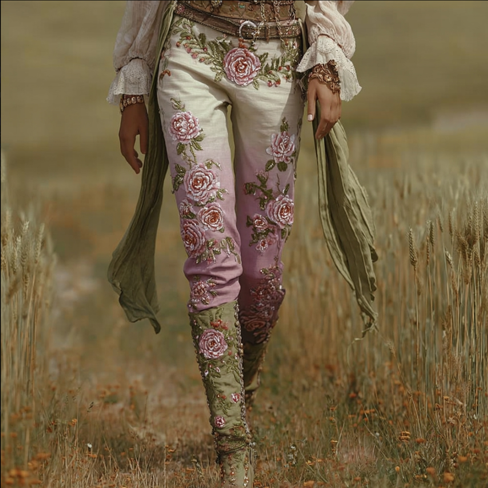 Women's Vintage Gradient Flower Embroidery Print Linen T-shirt