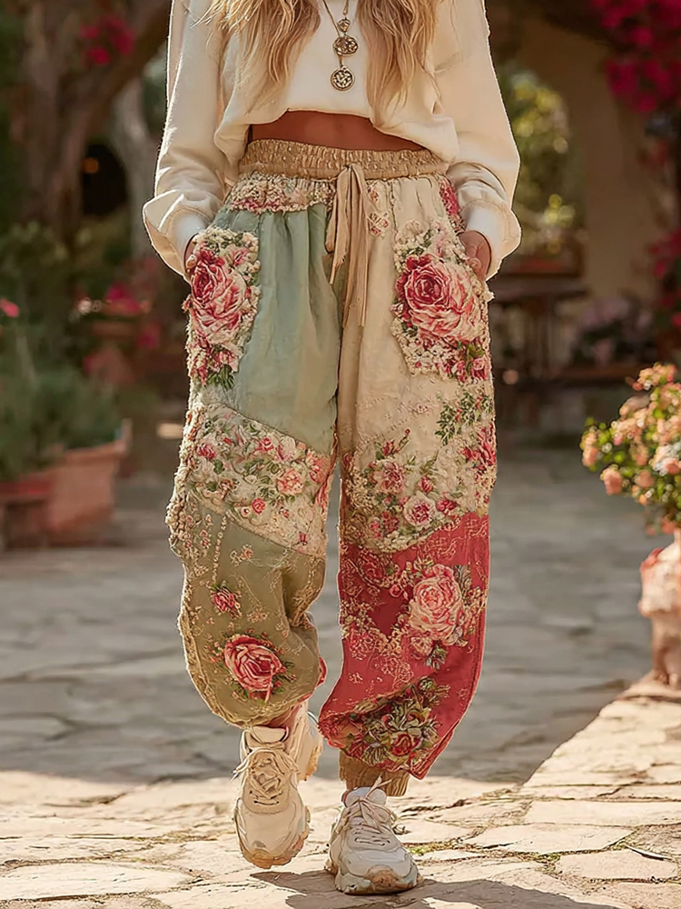 Classic Retro Rose And Floral Patchwork Art Contrast Waist Elastic Pocket Shorts