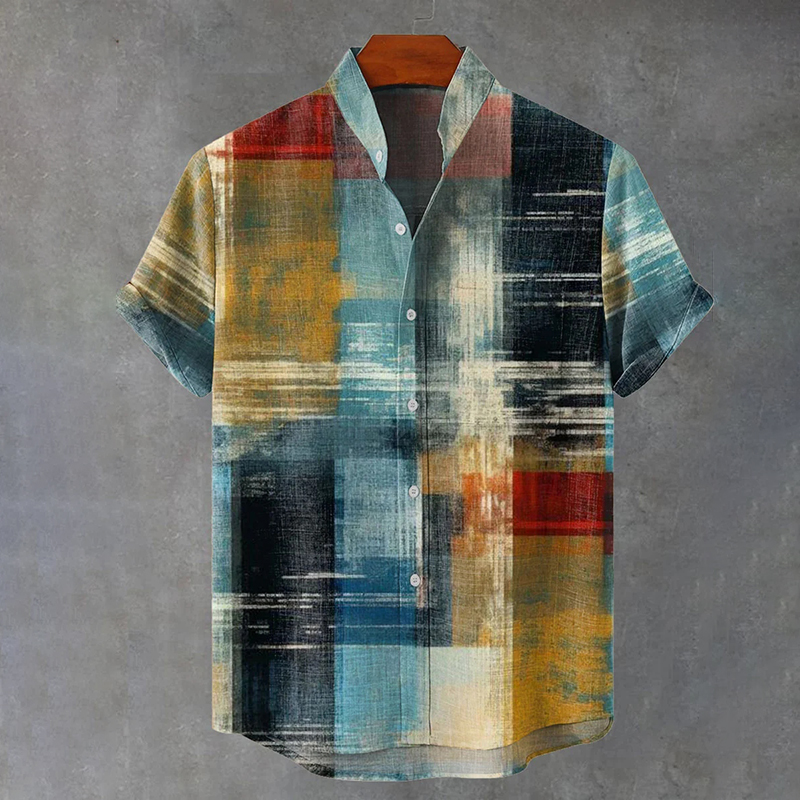 Men's Retro Colored Oil Painting Plaid Art Print Cotton And Linen Shirt