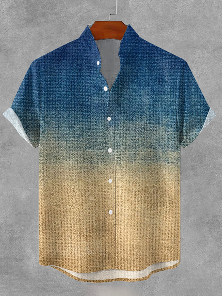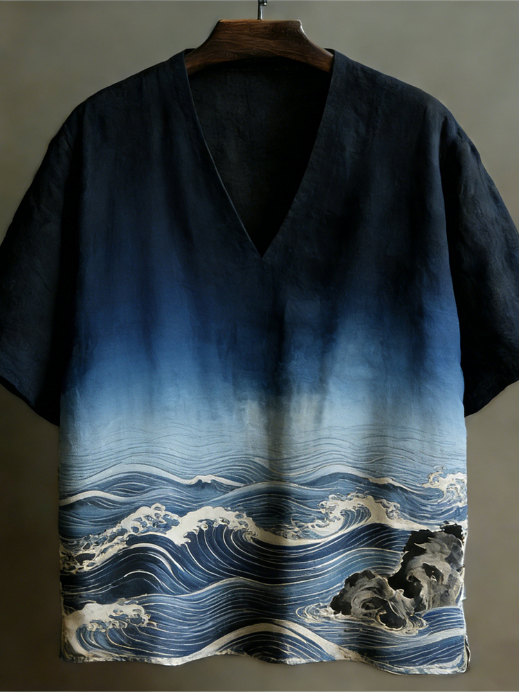 Japanese Ocean Gradient Pattern Linen Short Sleeve V-neck Shirt