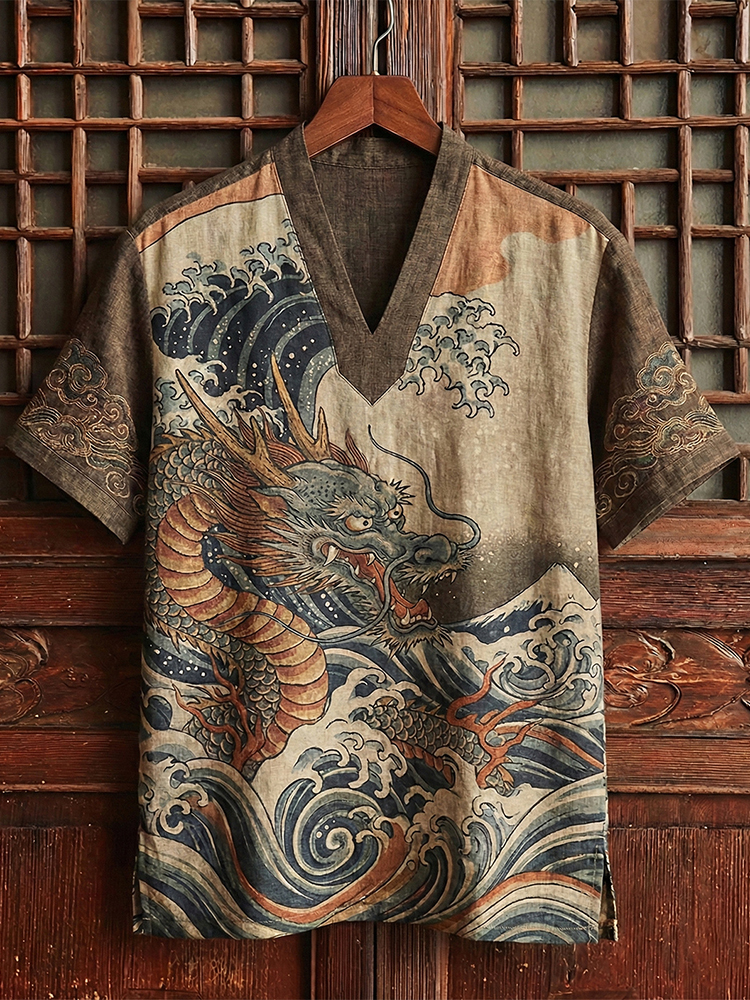 Men's Japanese-style Linen Dragon And Wave Art Linen Shirt