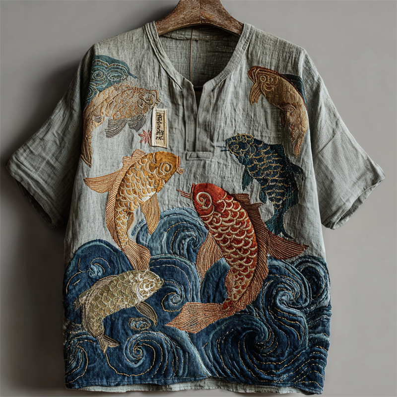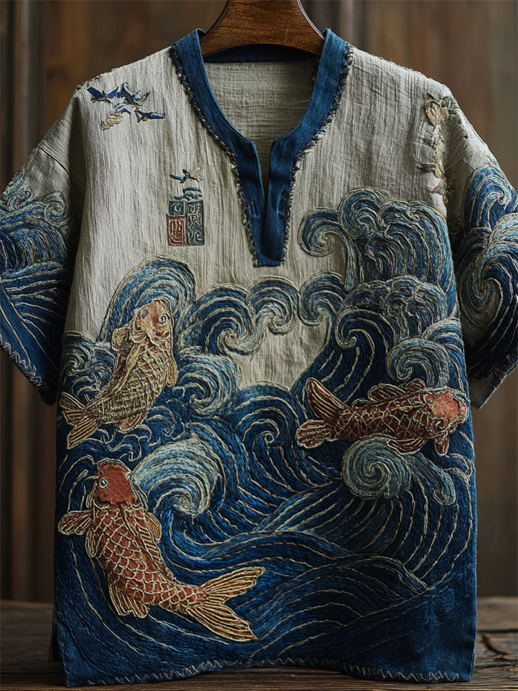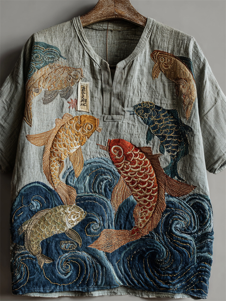 Japanese Carp Fish Sea Waves Embroidered Linen Shirt