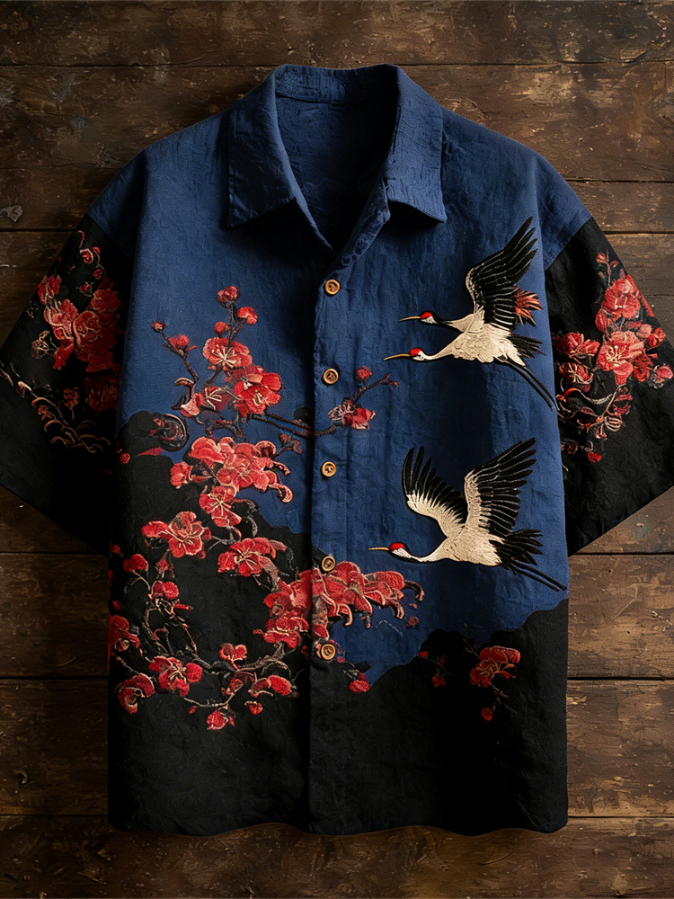Men's Vintage Cranes And Bamboo Japanese Art Embroidery Casual Shirt