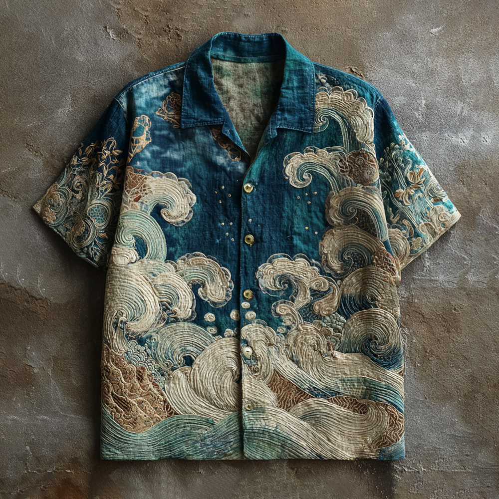 Sea Waves & Dragons Japanese Embroidered Linen Shirt