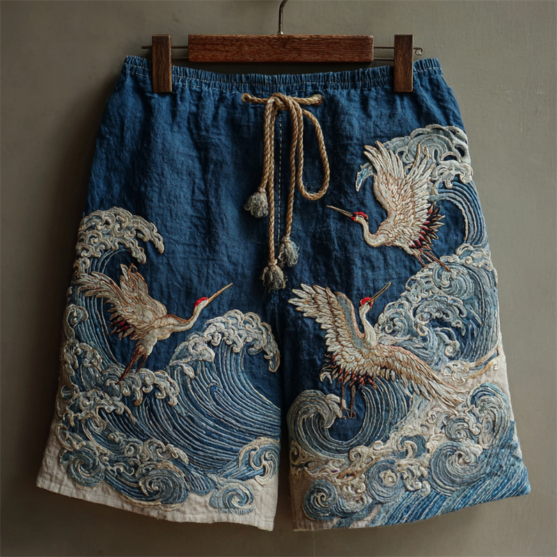 Men's Japanese Cranes Sea Waves Embroidered Linen Shorts