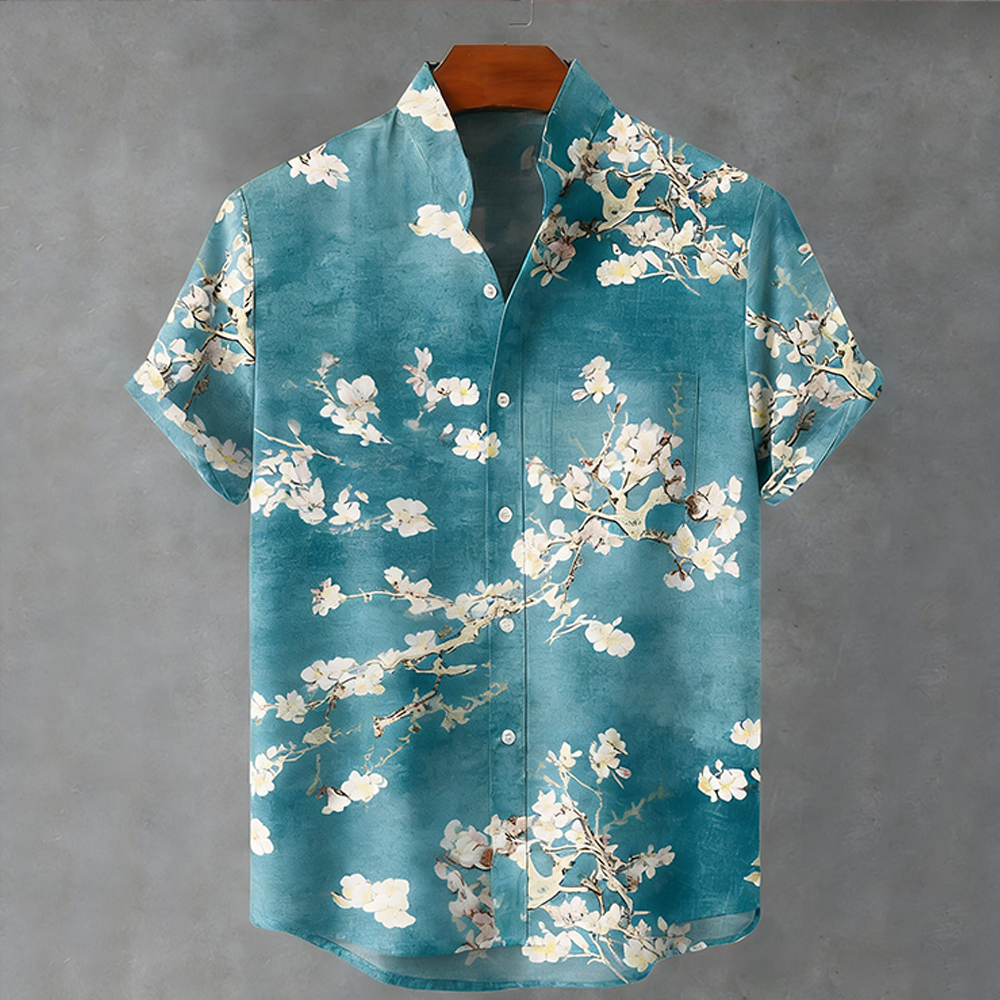 Men's Japanese Cherry Blossom And Crane Pattern Short Sleeve Shirt