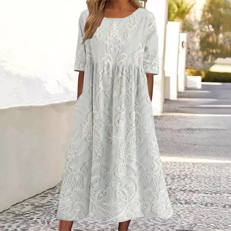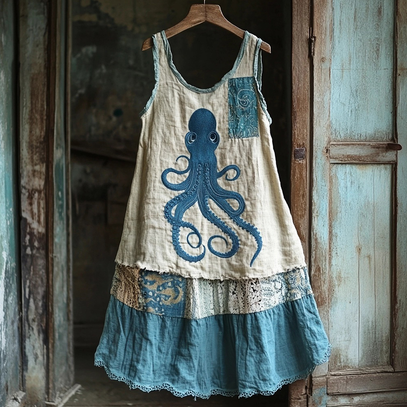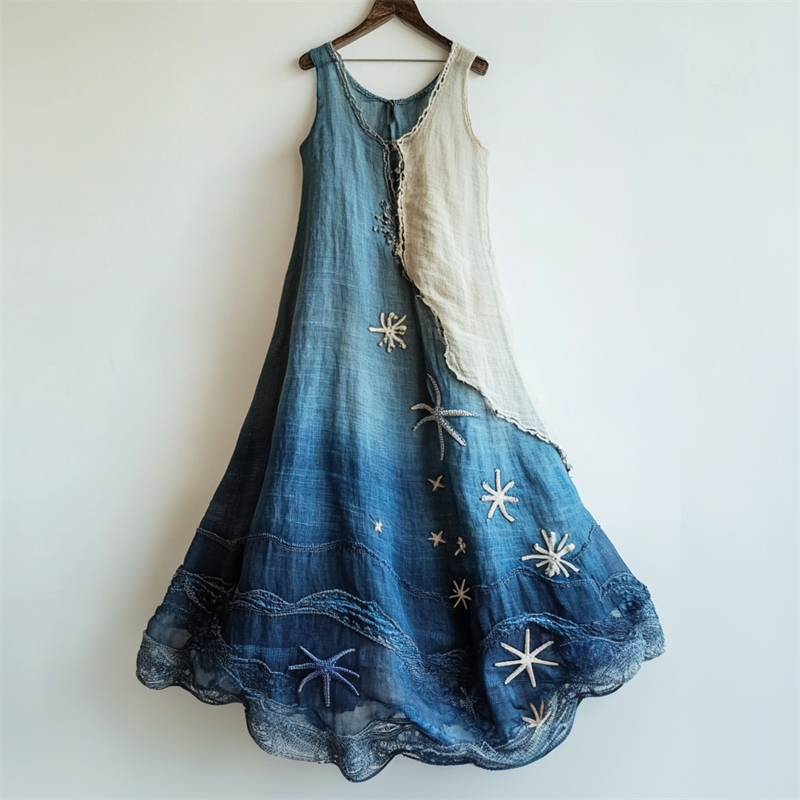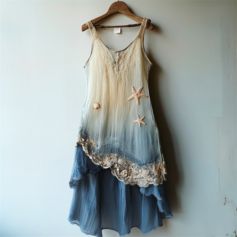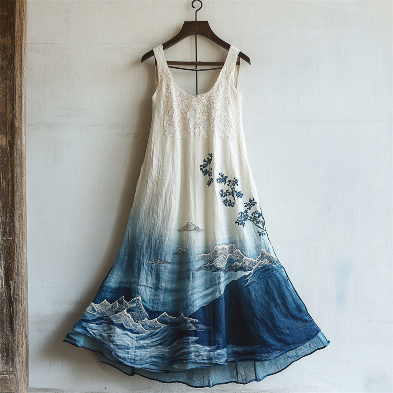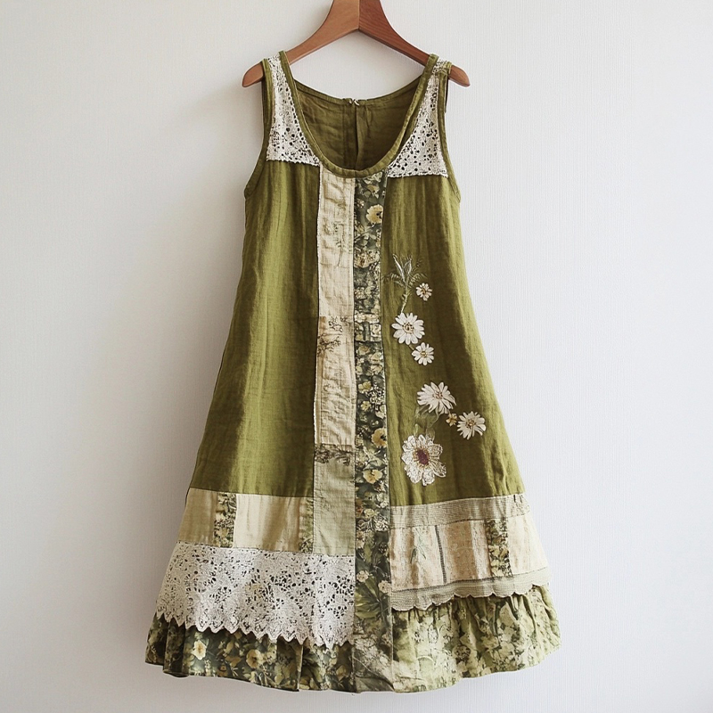 Spring Girl Green Pastoral Style Retro Bohemian Art Lace Embroidery Pattern Linen Tank Dress