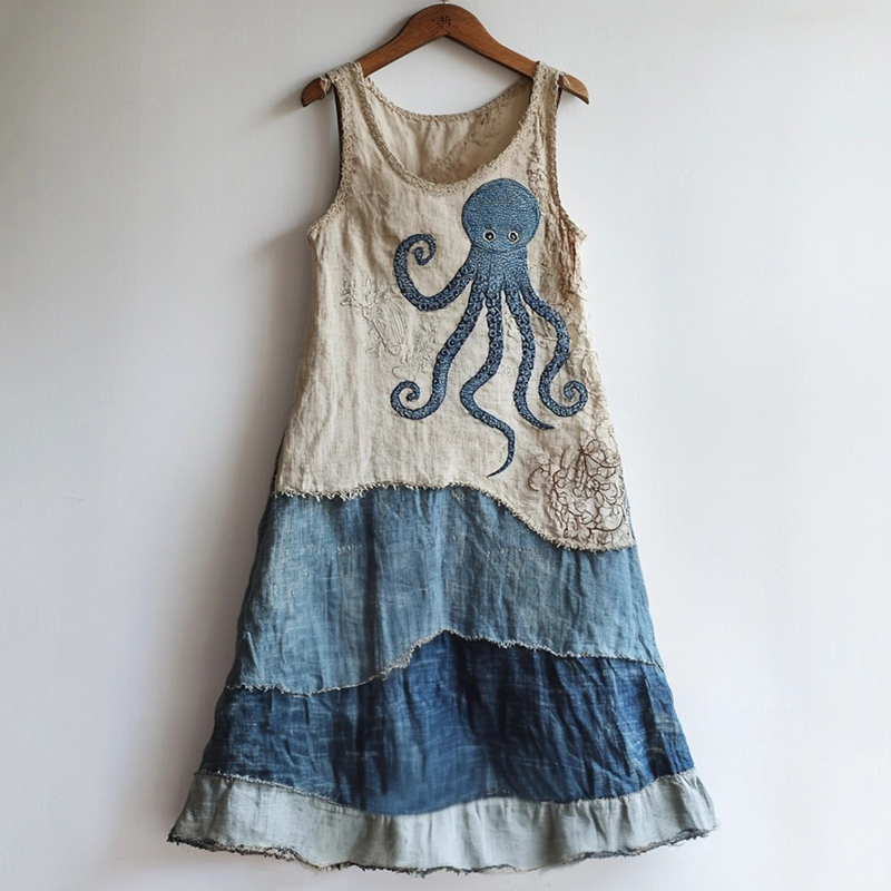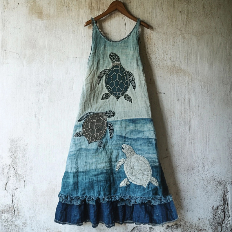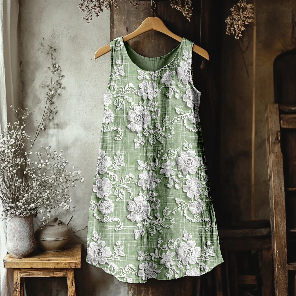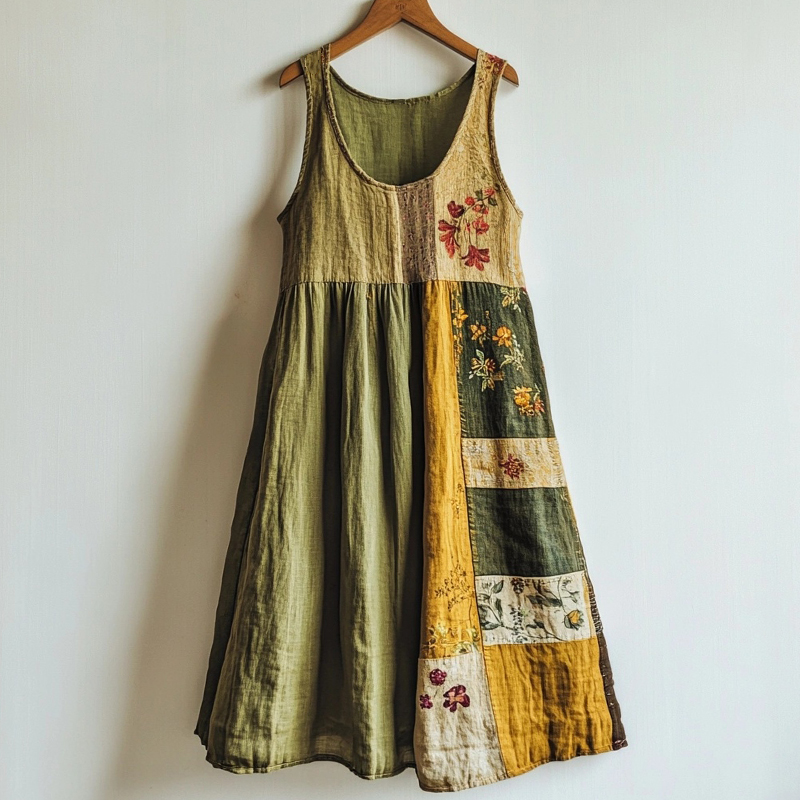 Spring Girl Green Pastoral Style Retro Floral Embroidery Pattern Art Linen Tank Dress