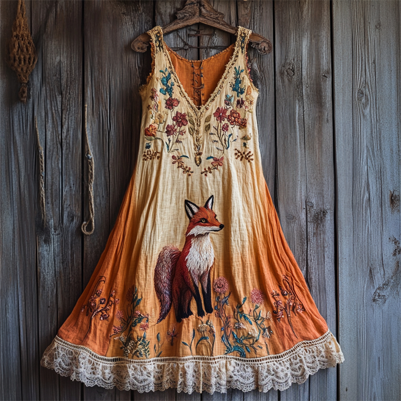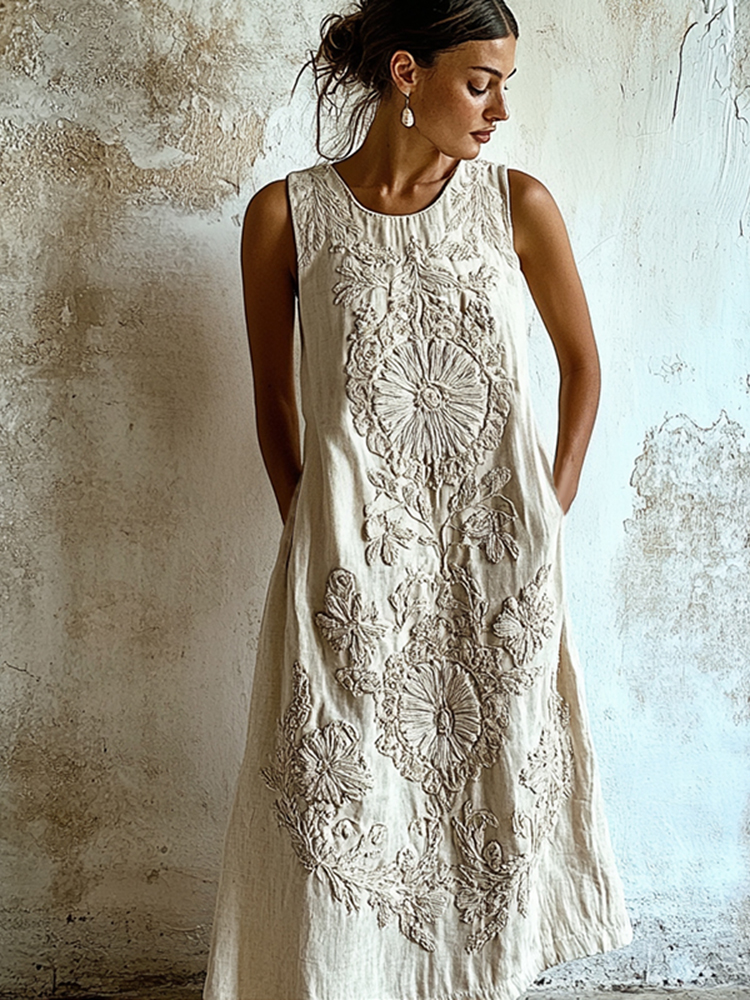 Spring Girl Green Pastoral Style Retro Bohemian Resort Art Floral Embroidery Pattern Linen Tank Dress