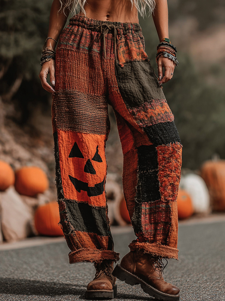 Bohemian Halloween Pumpkin Face Contrast Color Patchwork Linen Pants