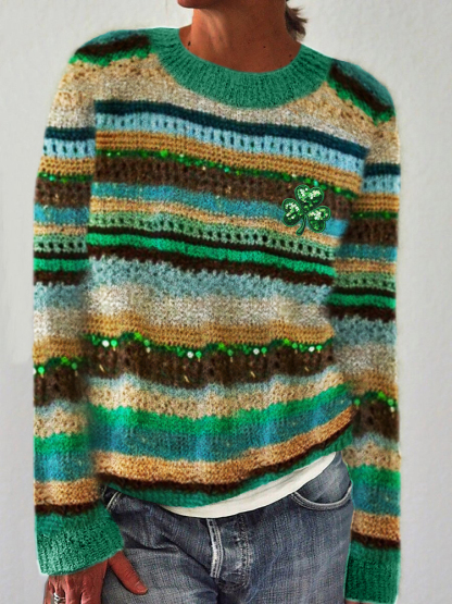 Shamrock Sequins Embroidered Colorful Striped Cozy Sweater