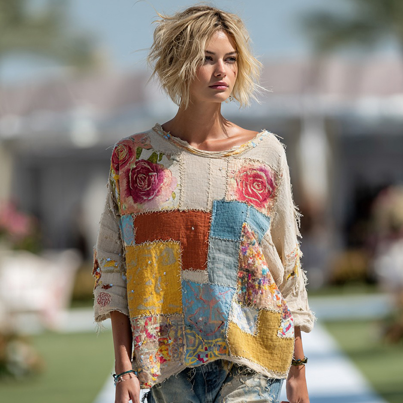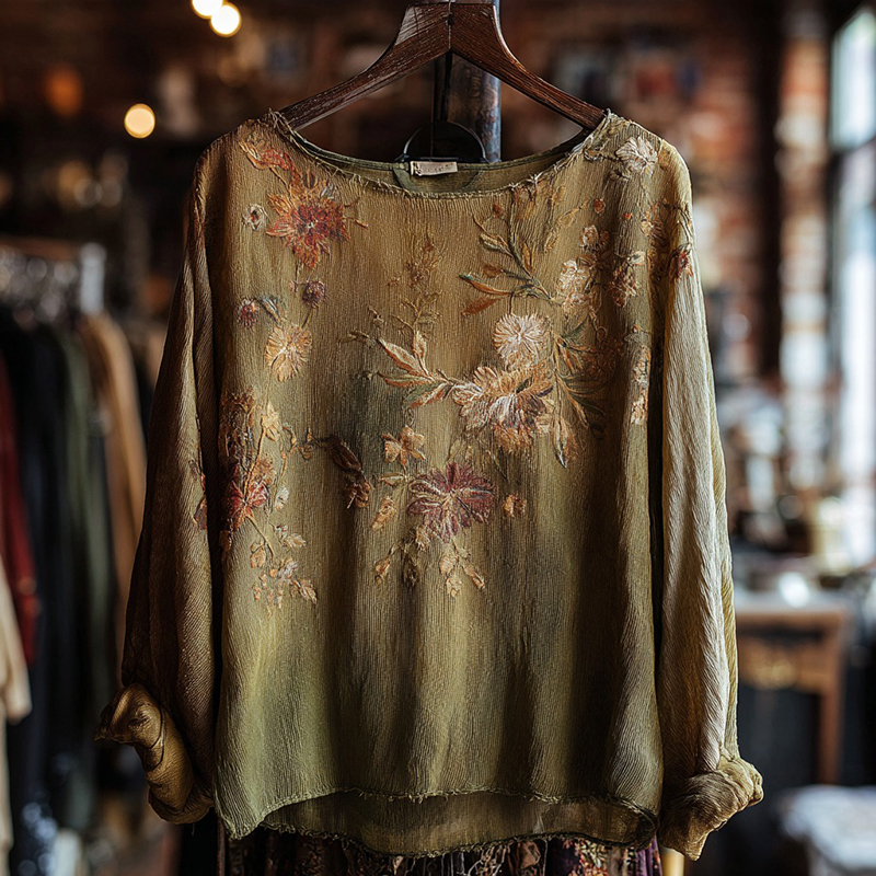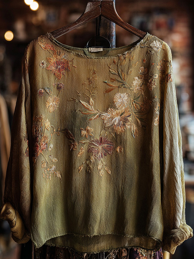Bohemian Retro Plant And Flower Pattern Casual Cotton And Linen Long-sleeve Top