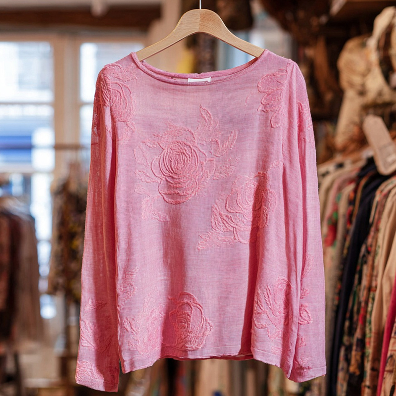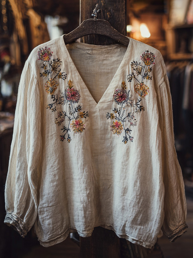 Women's Floral Embroidery Long-sleeved Linen Blend T-shirt