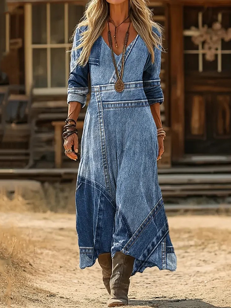 Women's Denim Printed Patchwork Art Print Dress