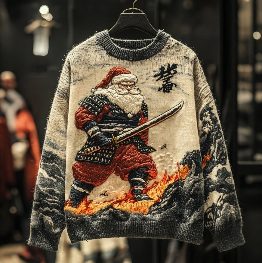 Men's Vintage Funny Christmas Santa Samurai Japanese Art Jacquard Knit Sweater