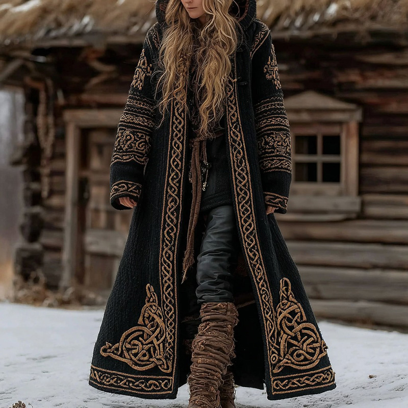 Women's Retro Tribal Celtic Knot Jacquard Knit Hooded Coat