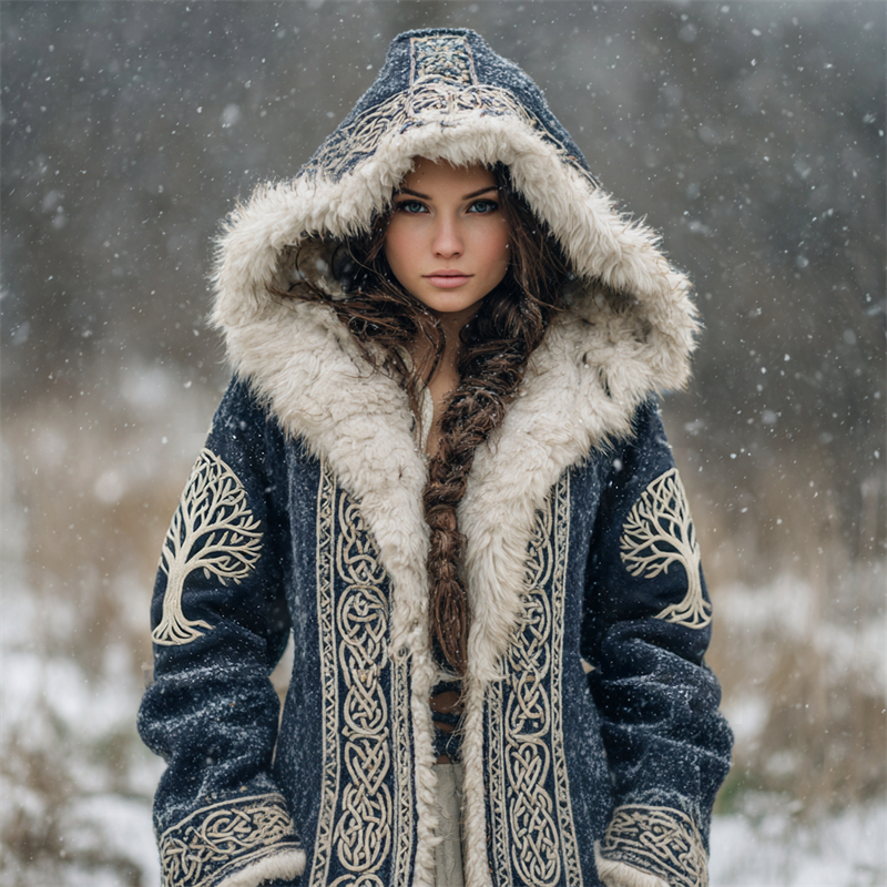 Viking Tree Of Life Celtic Cozy Fur Trim Hooded Cardigan