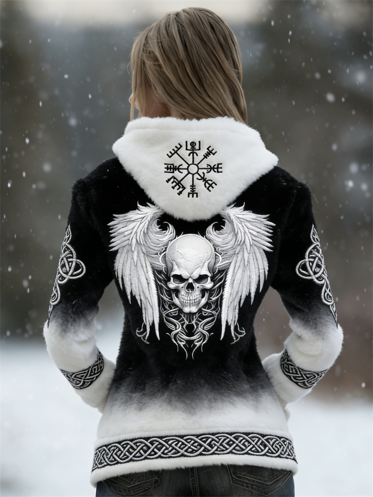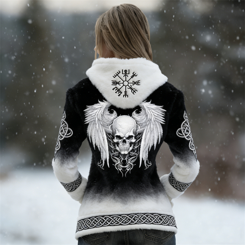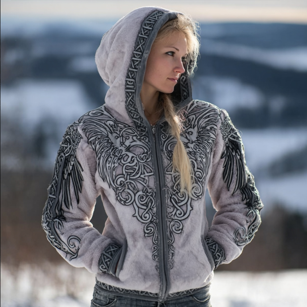 Women's Vintage Viking Celtic Wings Pattern Plush Flannel Zip Up Hoodie