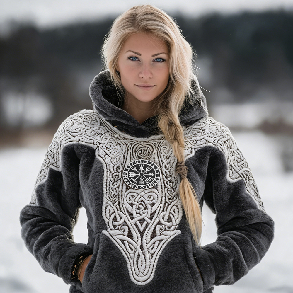 Vintage Viking Vegvisir Embroidered Cozy Plush Hoodie