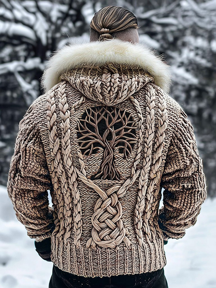 Men's Viking Tribal Tree Of Life Celtic Chunky Knit Fuzzy Hooded Zipper Cardigan