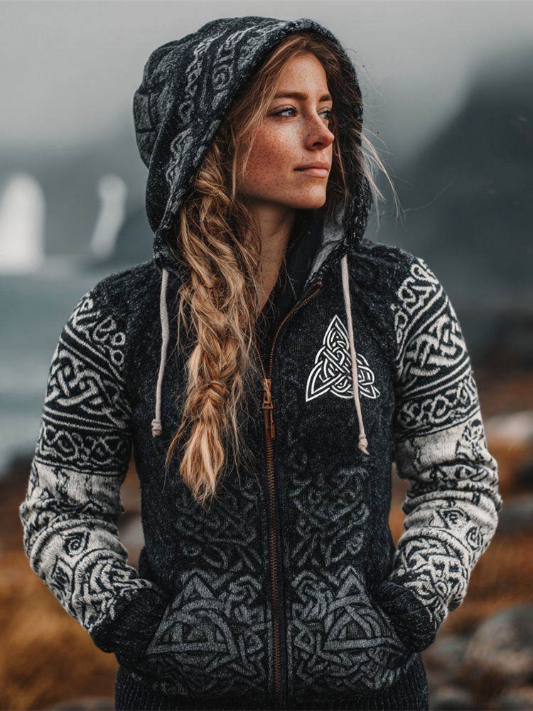 Women's Retro Viking Celtic Knot Jacquard Knit Zip-up Hooded Sweater
