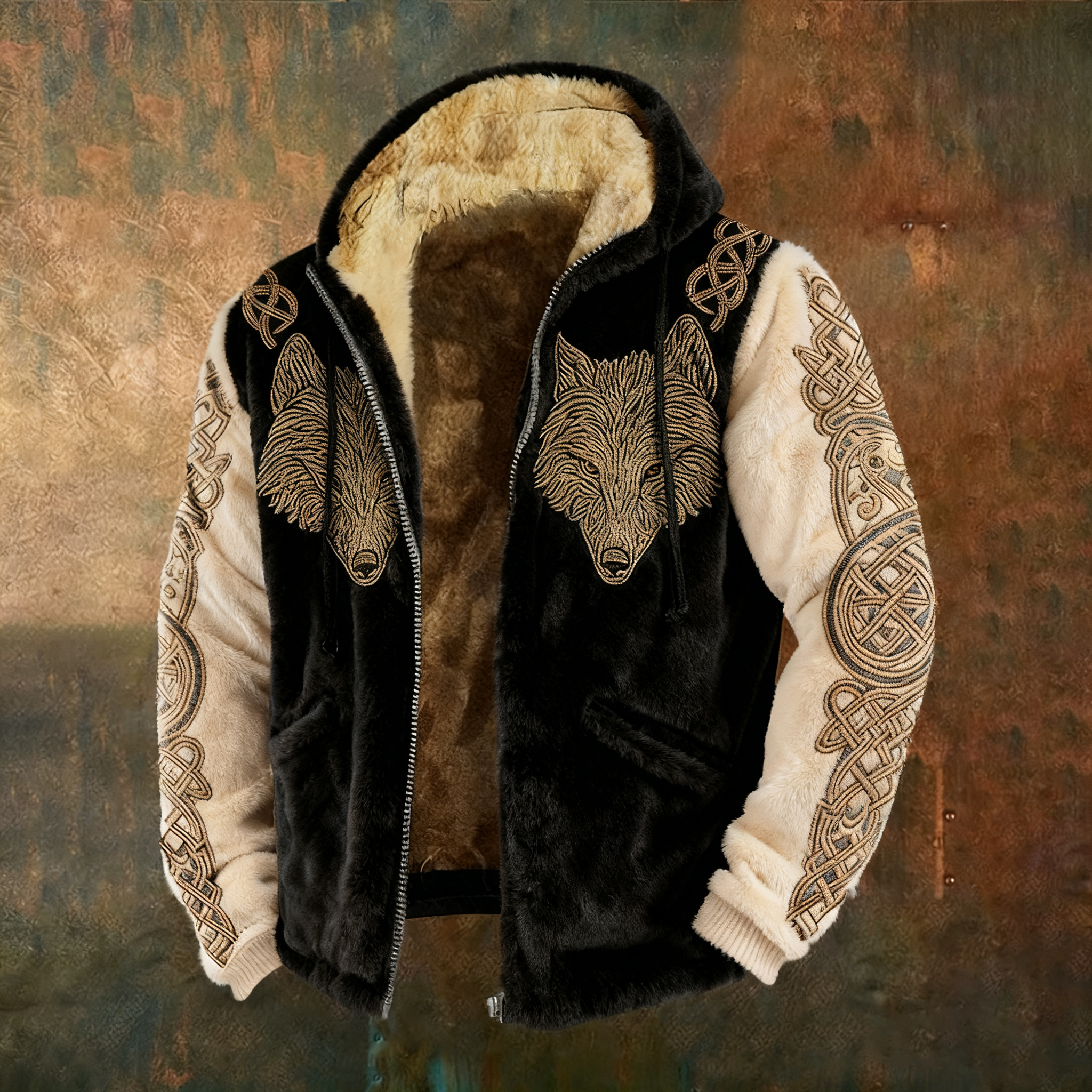 Men's Viking Tribal Jacquard Celtic With Wolves Inspired Plush Warm Zipped Hooded Jacket