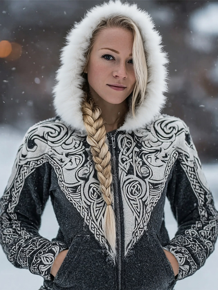 Vintage Celtic Knot Embroidered Fur Trim Full Zip Cozy Hoodie