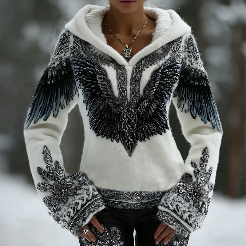 Women's Vintage Viking Wings Pattern Flannel Hoodie