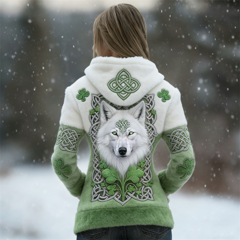 Viking Wolf Irish Shamrocks Celtic Contrast Cozy Plush Hoodie