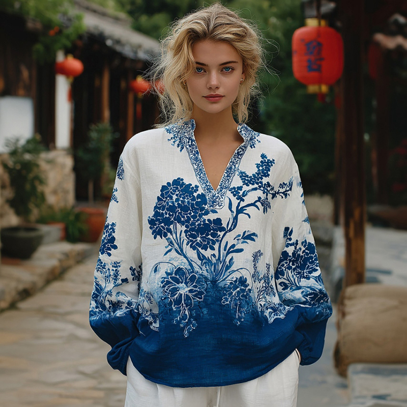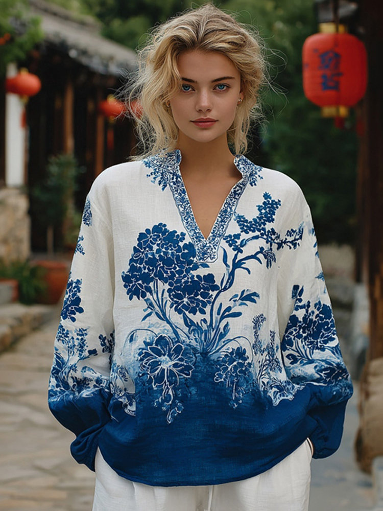 Women's Floral Pattern Linen V-neck T-shirt