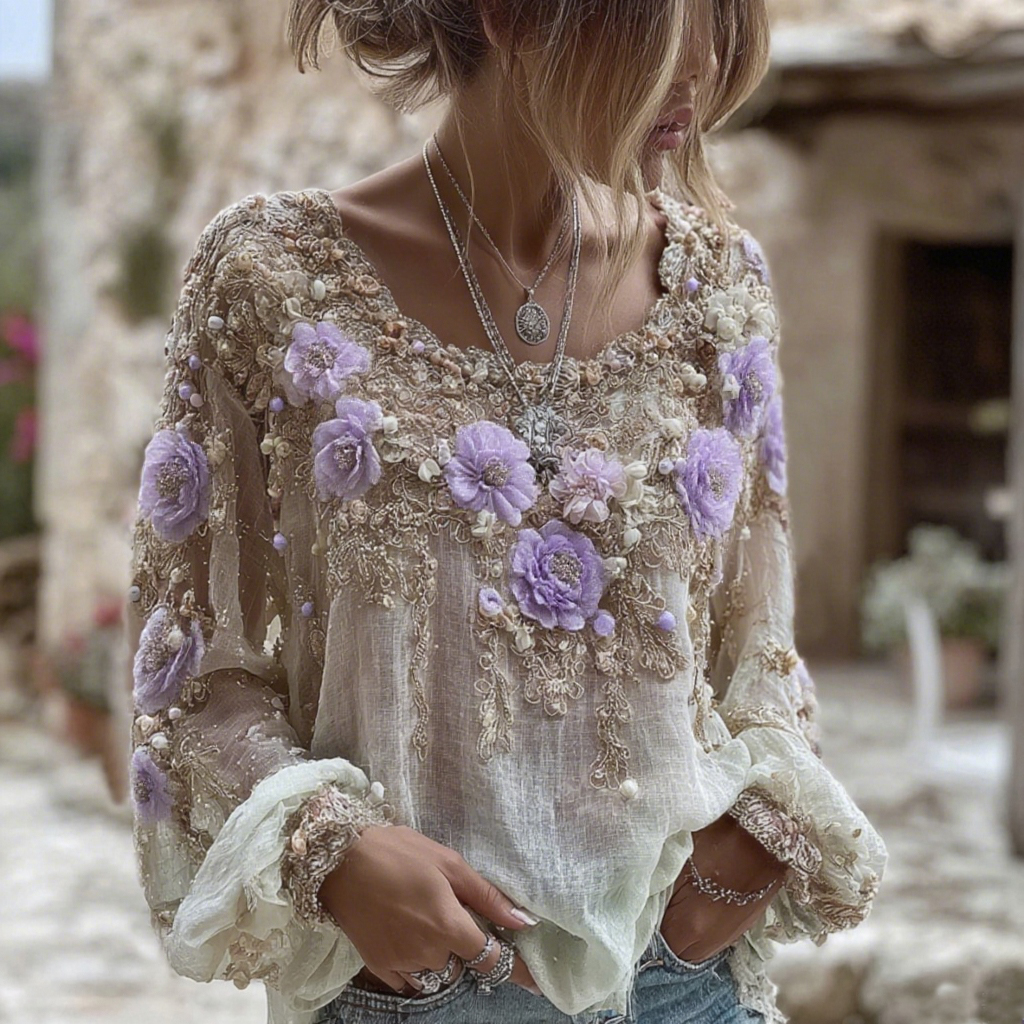 Women's Purple Flower Embroidery Art Round Neck Long Sleeve Linen Blend T-shirt
