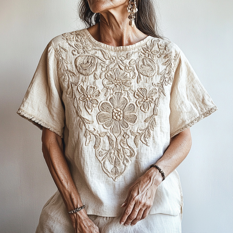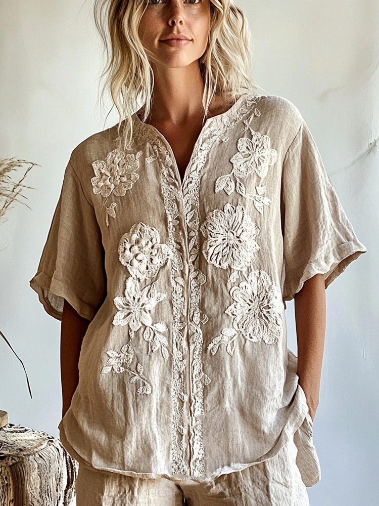 Vintage Floral Embroidered V-neck Loose Linen Blend T-shirt