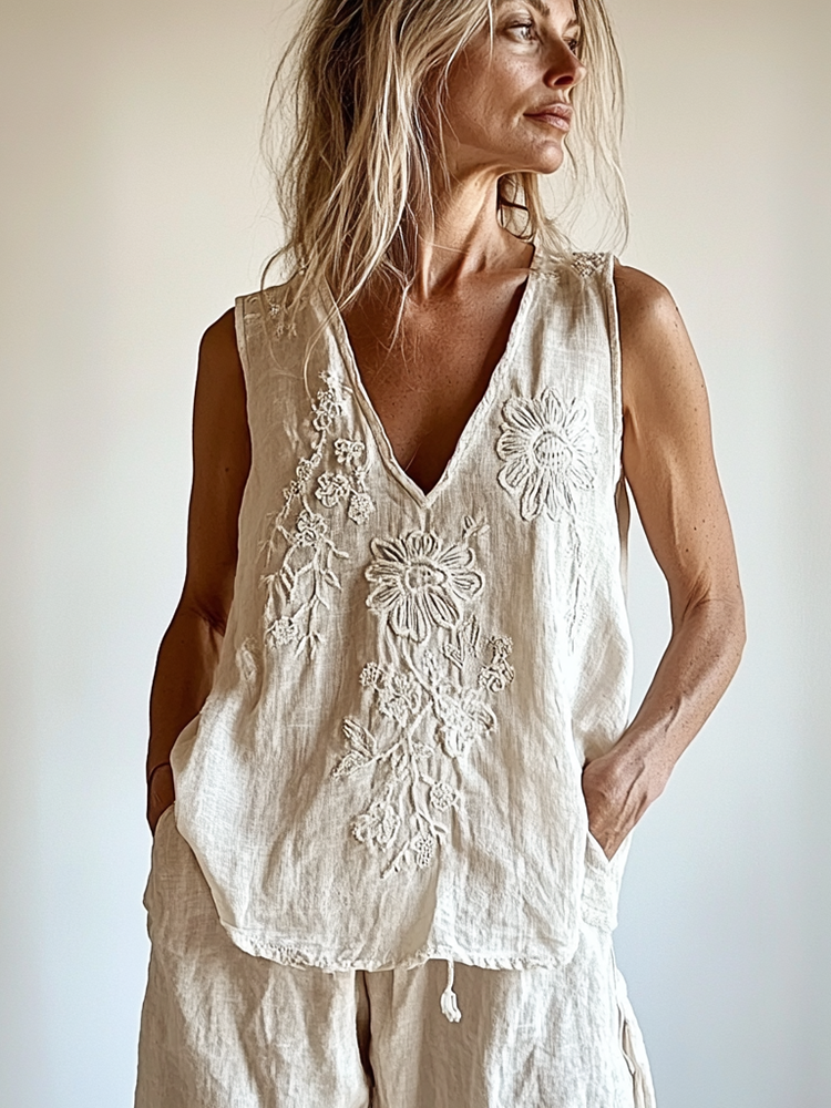 Vintage Embroidered Floral V-neck Linen Blend T-shirt