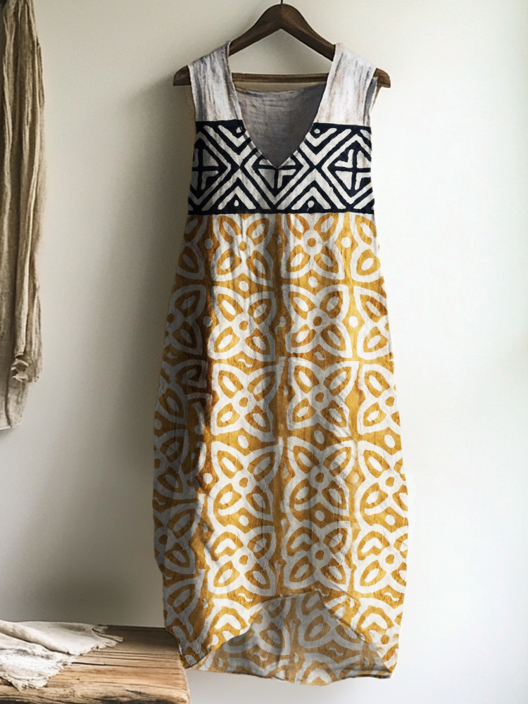 Indigo Ethnic Geometric Natural Block Print Flowy Linen Dress