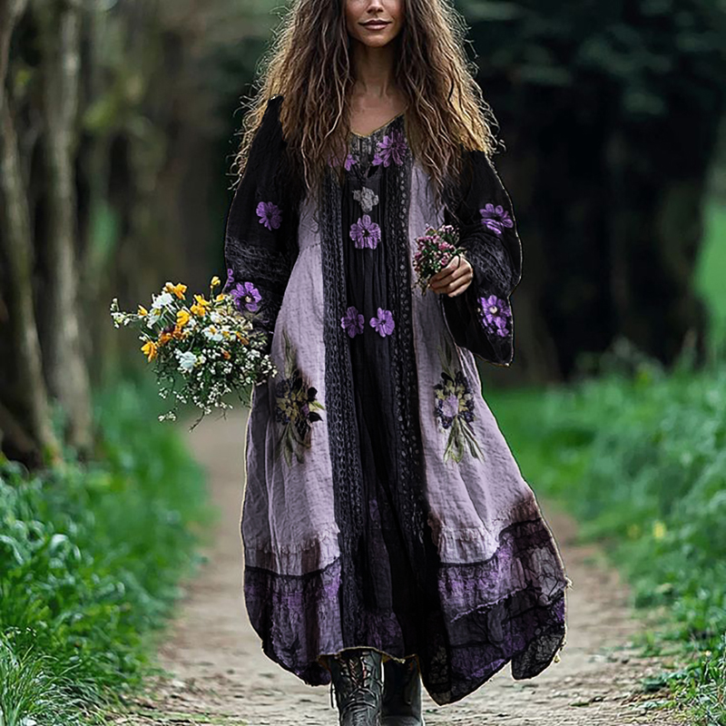Boho Floral Embroidered Patchwork Linen Blend Dress