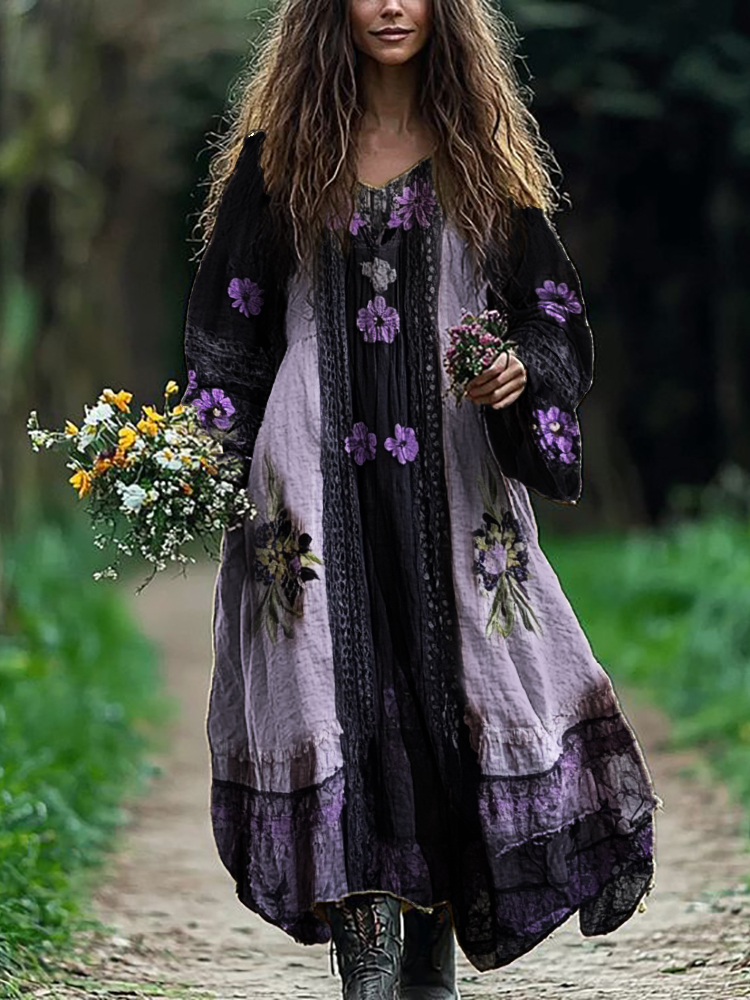 Purple Floral Lace Hem Patchwork Flowy Linen Dress