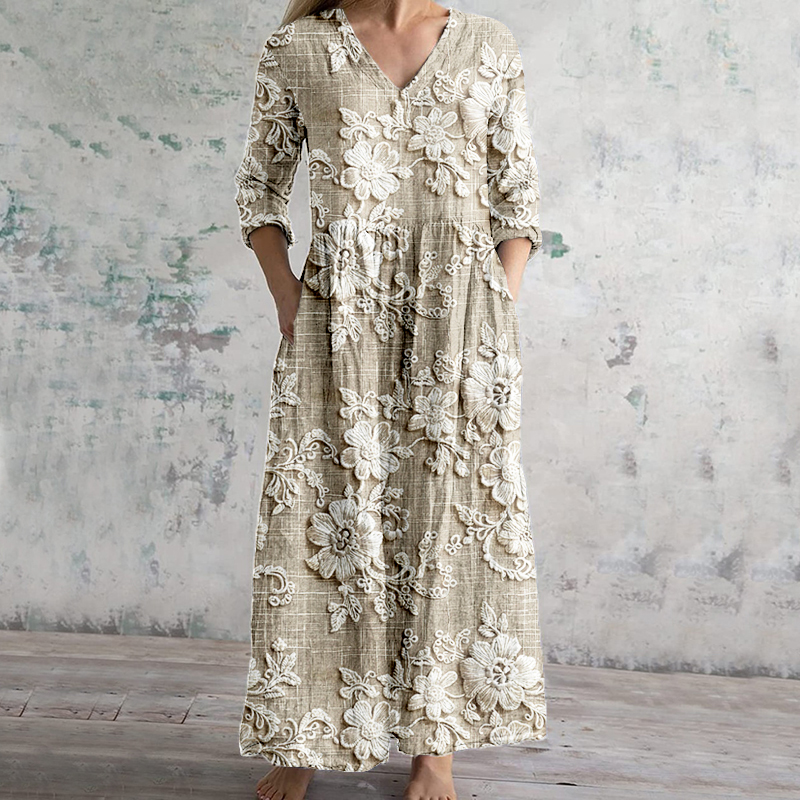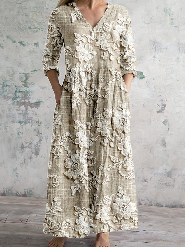 Vintage Floral Lace Embroidered V Neck Linen Blend Maxi Dress