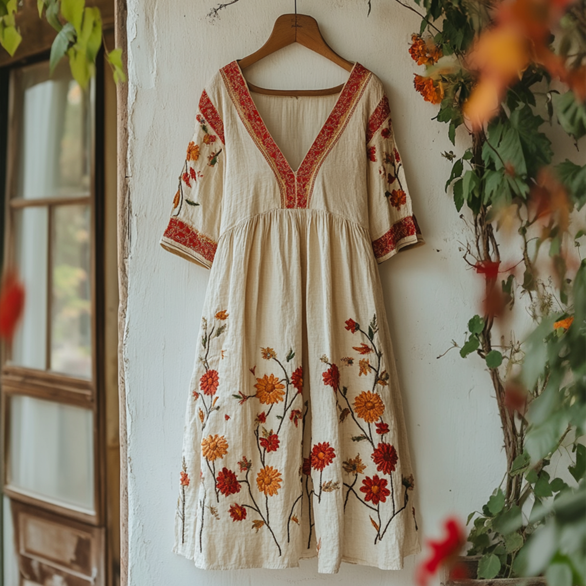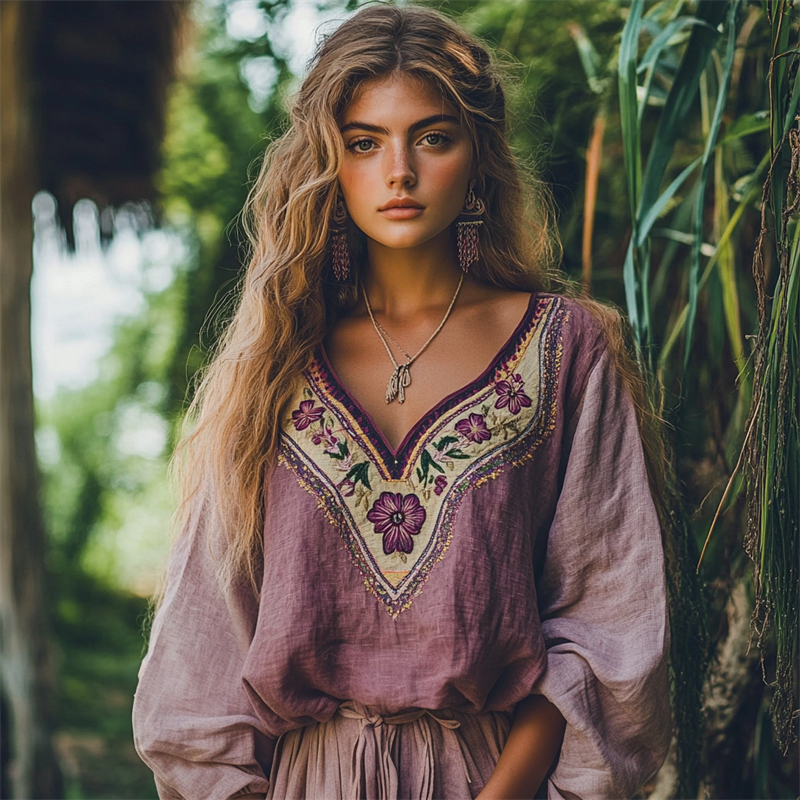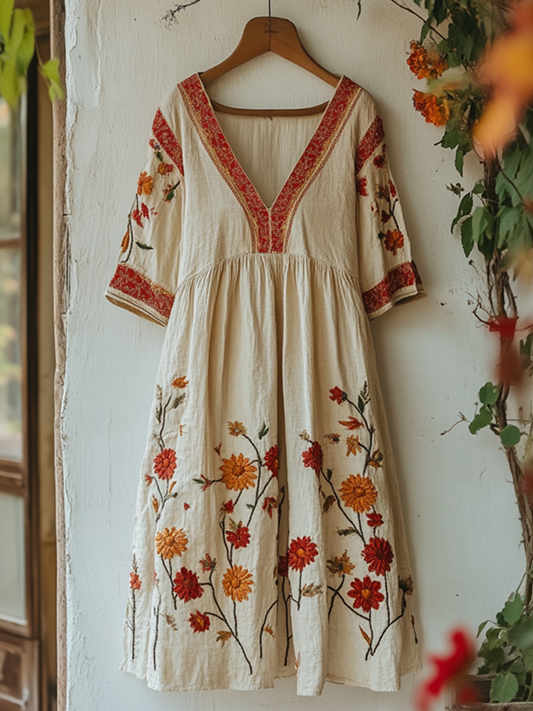 Women's Vintage Embroidered Flower V-neck Loose Linen Blend Midi Dress