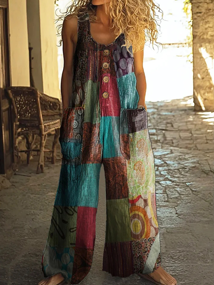 Women's Retro Floral Patchwork Art Print Casual Jumpsuit