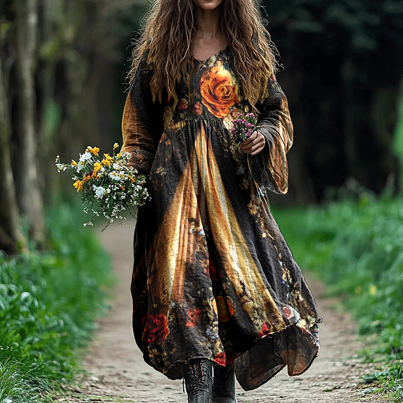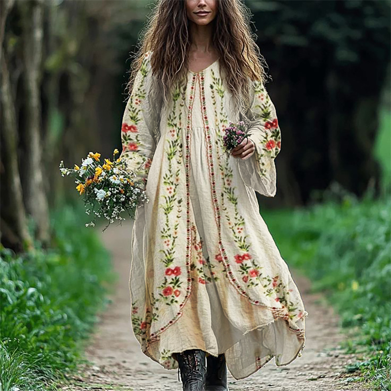 Vintage Boho Floral Art Linen Blend Maxi Dress