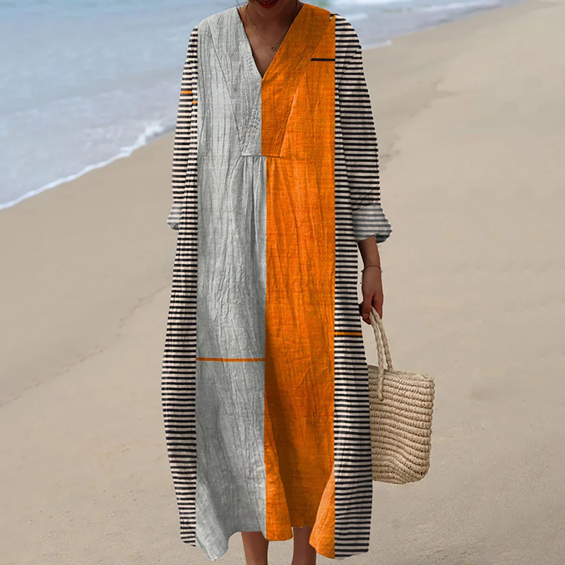 Vintage Colorblocked Linen Blend Cozy Maxi Dress