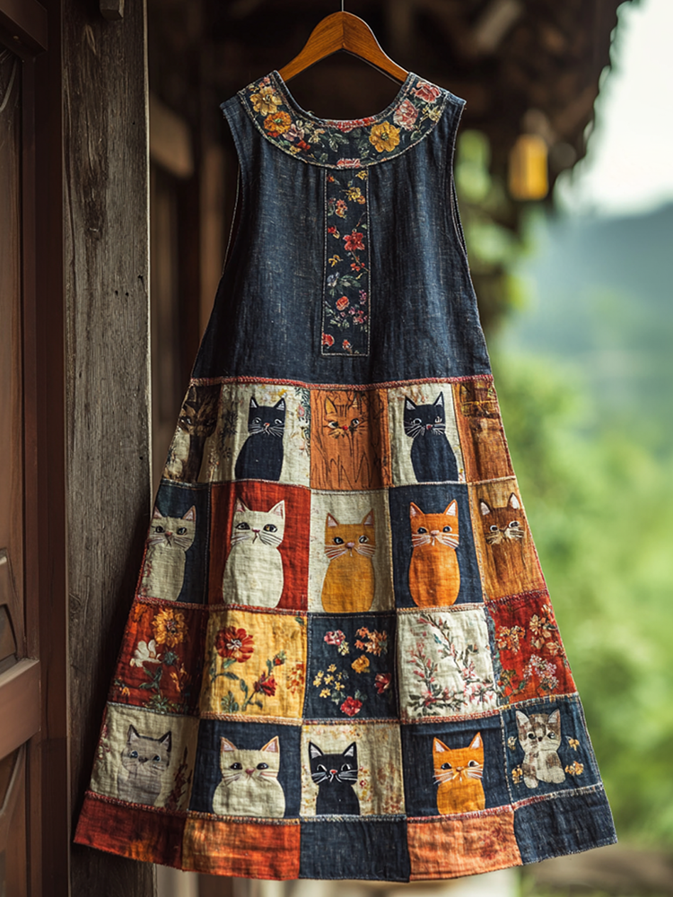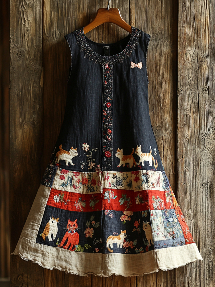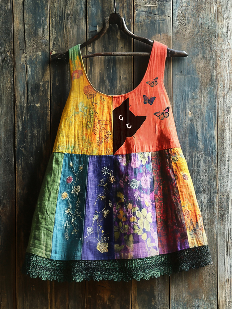 Vintage Cute Black Cat And Patchwork Linen Tank Dress