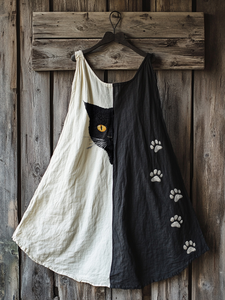 Cute Black Cat Embroidered Art Linen Contrast Color Sling Dress