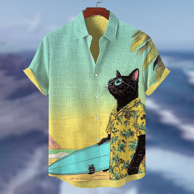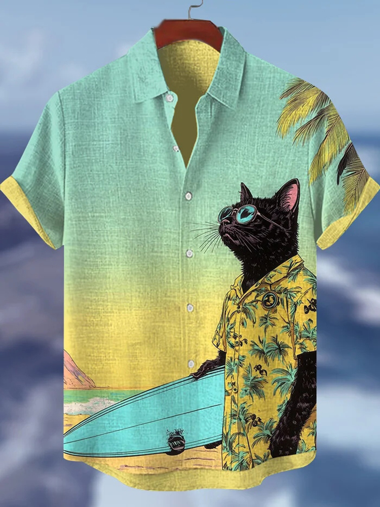 Men's Coolest Black Cat Surfing Art Print Vacation Short Sleeve Shirt