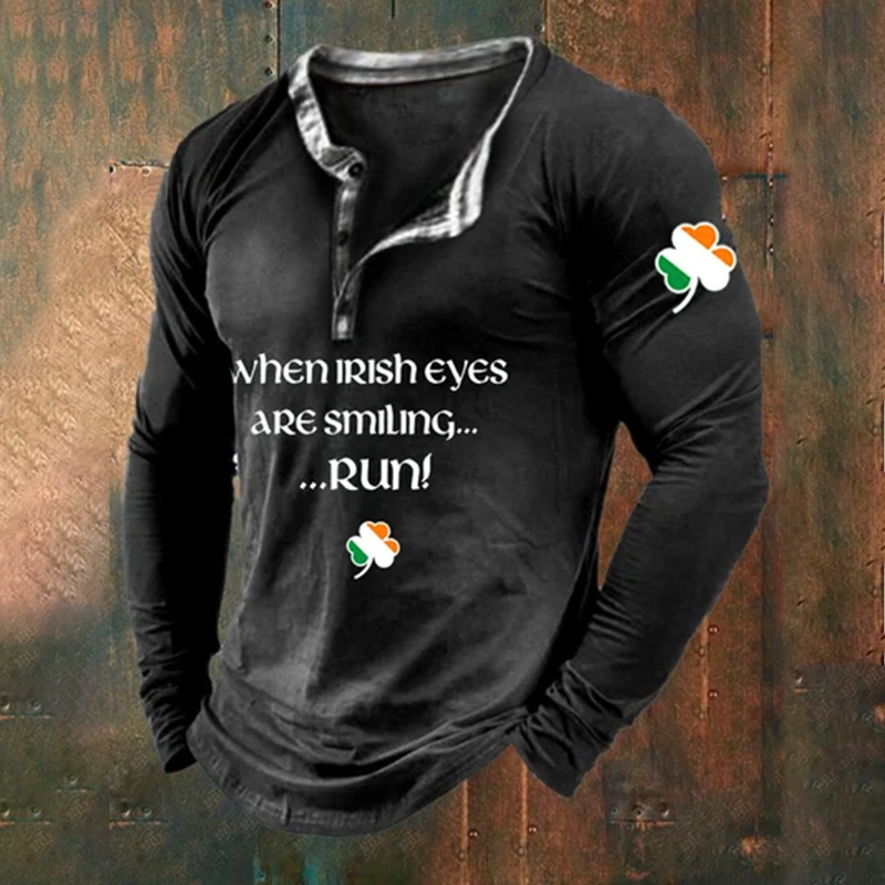 Men's When Irish Eyes Are Smiling Run Shamrock Print Button Long Sleeve Top
