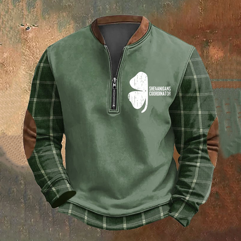 Men's St. Patrick's Day Plaid Print Zipper Collar Casual Sweatshirt