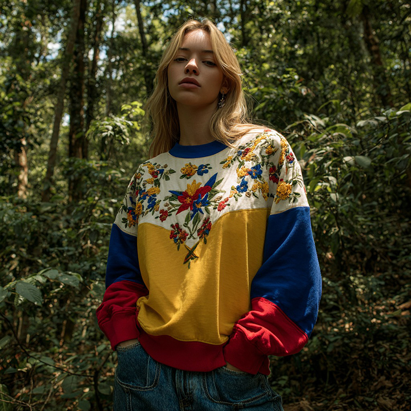 Retro Venezuela Inspired Ethnic Floral Color Blocking Cozy Crew Neck Sweatshirt