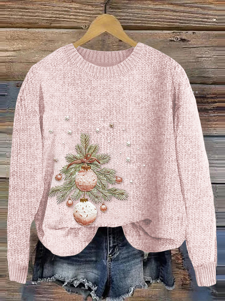 Women's Pink Christmas Tree Art Crew Neck Cozy Sweater