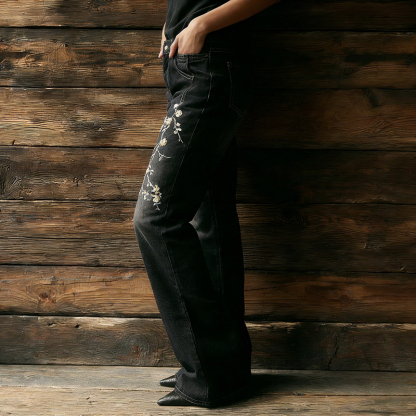 Japanese Art Cherry Blossom Embroidered Washed Flared Jeans